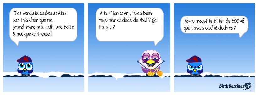 Case 1:Bird 1: J'ai vendu le cadeau hélas pas très cher que ma grand-mère m'a fait, une boite à musique affreuse ! | Case 2: Bird 1: Allo ! Mon chéri, tu as bien reçu mon cadeau de Noël ? Ça t'a plu ? | Case 3: Bird 1: As-tu trouvé le billet de 500 € que j'avais caché dedans ?