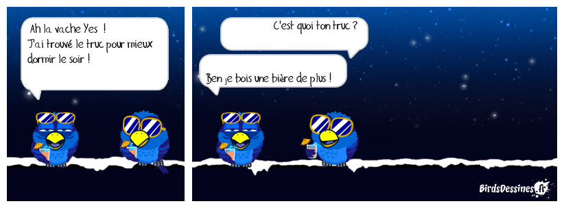 Case 1:Bird 1: Ah la vache Yes ! J'ai trouvé le truc pour mieux dormir le soir ! | Case 2: Bird 1: C'est quoi ton truc ? Bird 2: Ben je bois une bière de plus ! | Case 3: