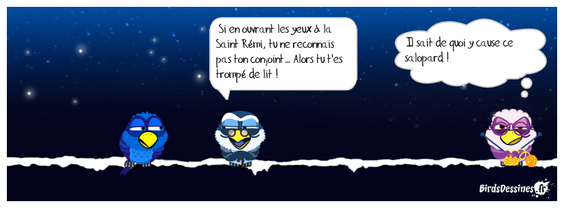 Case 1: | Case 2: Bird 1: Si en ouvrant les yeux à la Saint Rémi, tu ne reconnais pas ton conjoint… Alors tu t'es trompé de lit ! | Case 3: Bird 1: Il sait de quoi y cause ce salopard !