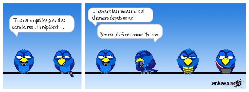 Case 1:Bird 1: T'as remarqué les grévistes dans la rue , ils répètent ... | Case 2: Bird 1: … toujours les mêmes mots et chansons depuis un an ! Bird 2: Ben oui ,ils font comme Macron | Case 3: