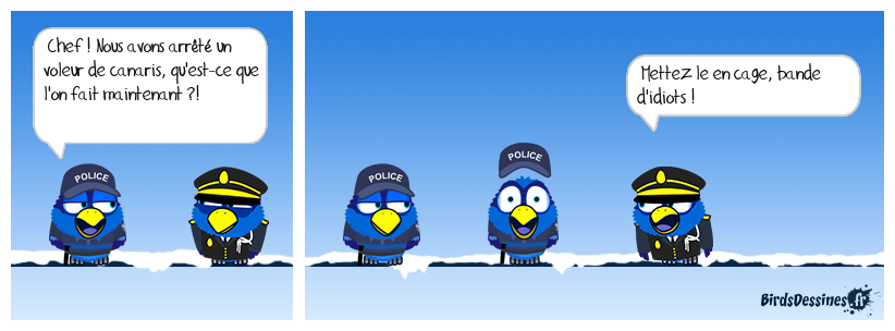 Case 1:Bird 1: Chef ! Nous avons arrêté un voleur de canaris, qu'est-ce que l'on fait maintenant ?! | Case 2: | Case 3: Bird 1: Mettez le en cage, bande d'idiots !