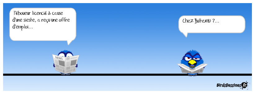 Case 1:Bird 1: l'éboueur licencié à cause d'une sieste, a reçu une offre d'emploi... | Case 2: | Case 3: Bird 1: Chez Bultex® ?...