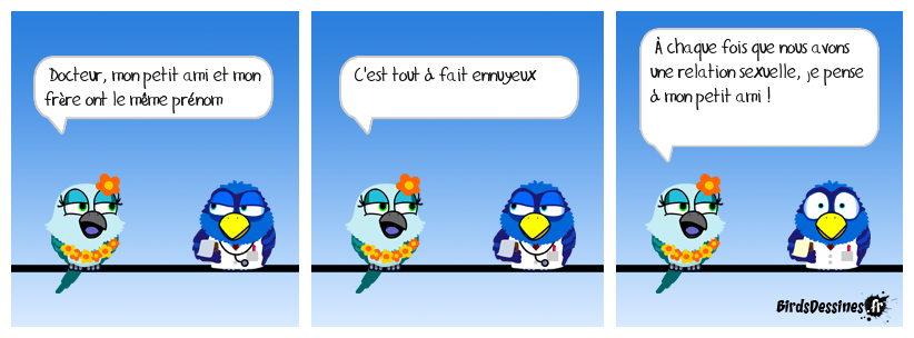Case 1:Bird 1: Docteur, mon petit ami et mon frère ont le même prénom | Case 2: Bird 1: C'est tout à fait ennuyeux | Case 3: Bird 1: À chaque fois que nous avons une relation sexuelle, je pense à mon petit ami !
