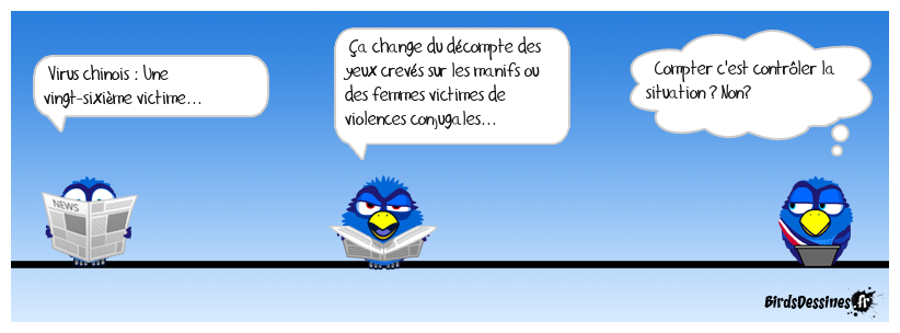 Case 1:Bird 1: Virus chinois : Une vingt-sixième victime... | Case 2: Bird 1: Ça change du décompte des yeux crevés sur les manifs ou des femmes victimes de violences conjugales... | Case 3: Bird 1: Compter c'est contrôler la situation ? Non?