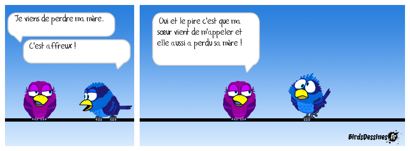 Case 1:Bird 1: Je viens de perdre ma mère.Bird 2: C'est affreux ! | Case 2: Bird 1: Oui et le pire c'est que ma sœur vient de m'appeler et elle aussi a perdu sa mère ! | Case 3: