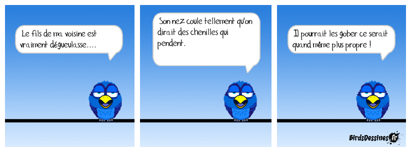 Case 1:Bird 1: Le fils de ma voisine est vraiment dégueulasse.... | Case 2: Bird 1: Son nez coule tellement qu'on dirait des chenilles qui pendent. | Case 3: Bird 1: Il pourrait les gober ce serait quand même plus propre !