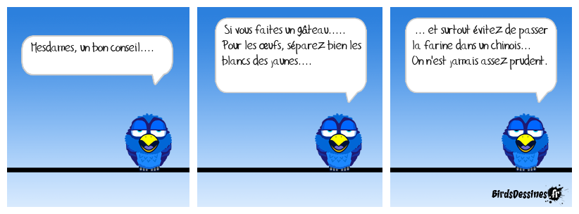 Case 1:Bird 1: Mesdames, un bon conseil.... | Case 2: Bird 1: Si vous faites un gâteau..... Pour les œufs, séparez bien les blancs des jaunes.... | Case 3: Bird 1: ... et surtout évitez de passer la farine dans un chinois... On n'est jamais assez prudent.