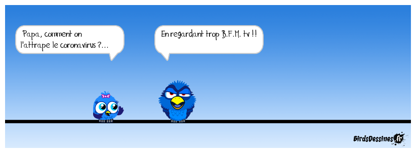 Case 1:Bird 1: Papa, comment on l'attrape le coronavirus ?... | Case 2: Bird 1: En regardant trop B.F.M. tv !! | Case 3: