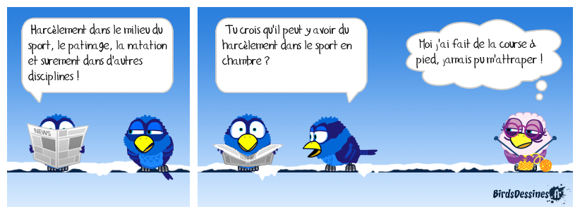 Case 1:Bird 1: Harcèlement dans le milieu du sport, le patinage, la natation et surement dans d'autres disciplines ! | Case 2: Bird 1: Tu crois qu'il peut y avoir du harcèlement dans le sport en chambre ? | Case 3: Bird 1: Moi j'ai fait de la course à pied, jamais pu m'attraper !