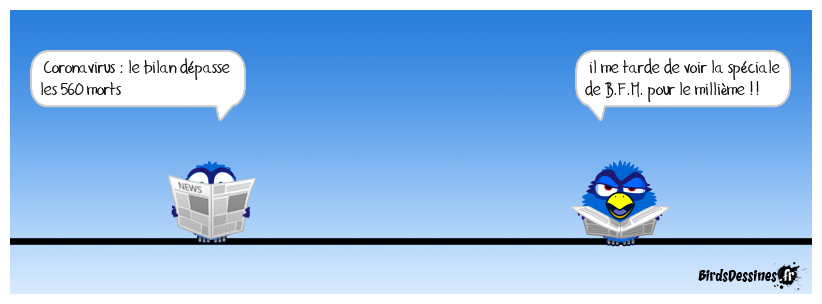 Case 1:Bird 1: Coronavirus : le bilan dépasse les 560 morts | Case 2: | Case 3: Bird 1: il me tarde de voir la spéciale de B.F.M. pour le millième !!
