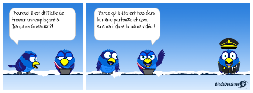 Case 1:Bird 1: Pourquoi il est difficile de trouver un remplaçant à Benjamin Griveaux ?! | Case 2: Bird 1: Parce qu'ils étaient tous dans la même partouze et donc surement dans la même vidéo ! | Case 3: