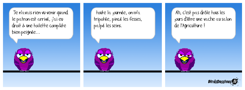 Case 1:Bird 1: Je n'avais rien vu venir quand le patron est arrivé, j'ai eu droit à une toilette complète bien peignée... | Case 2: Bird 1: toute la journée, on m'a tripotée, pincé les fesses, palpé les seins. | Case 3: Bird 1: Ah, c'est pas drôle tous les jours d'être une vache au salon de l'Agriculture !