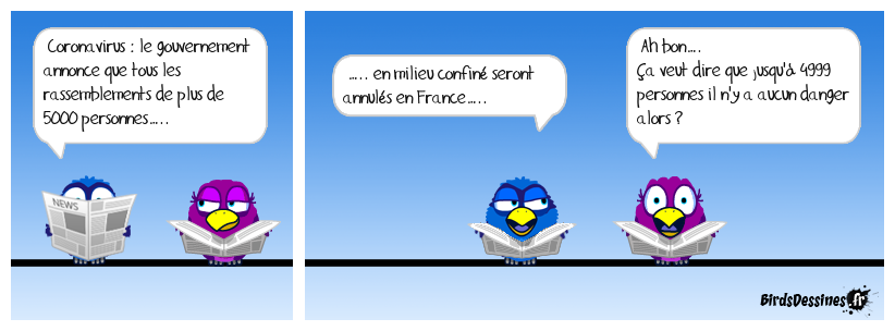 Case 1:Bird 1: Coronavirus : le gouvernement annonce que tous les rassemblements de plus de 5000 personnes….. | Case 2: Bird 1: ….. en milieu confiné seront annulés en France….. | Case 3: Bird 1: Ah bon…. Ça veut dire que jusqu'à 4999 personnes il n'y a aucun danger alors ?