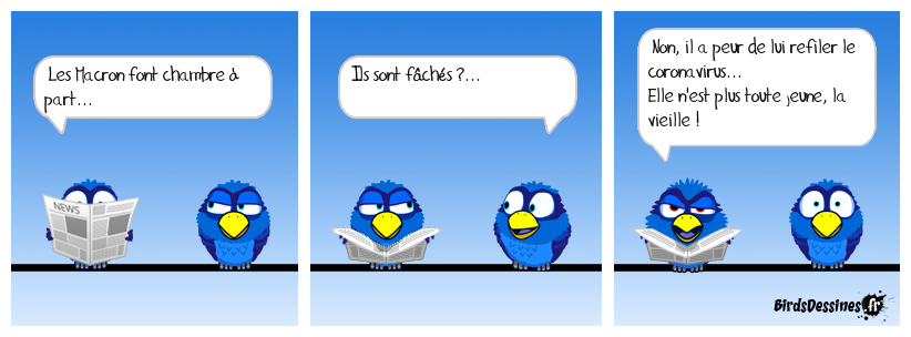 Case 1:Bird 1: Les Macron font chambre à part... | Case 2: Bird 1: Ils sont fâchés ?... | Case 3: Bird 1: Non, il a peur de lui refiler le coronavirus... Elle n'est plus toute jeune, la vieille !