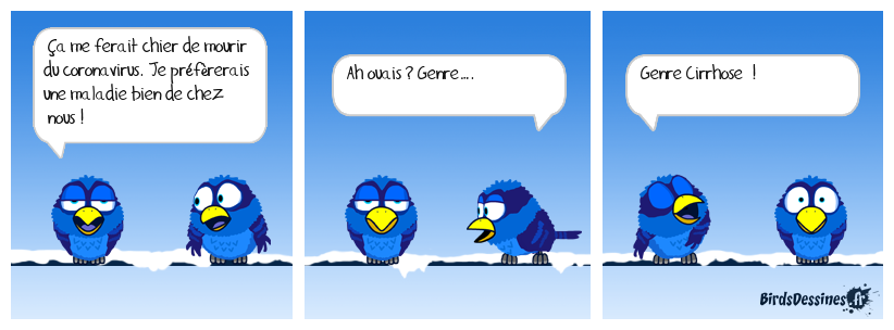 Case 1:Bird 1: Ça me ferait chier de mourir du coronavirus. Je préfèrerais une maladie bien de chez nous ! | Case 2: Bird 1: Ah ouais ? Genre…. | Case 3: Bird 1: Genre Cirrhose !