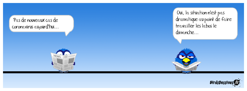 Case 1:Bird 1: Pas de nouveaux cas de coronavirus aujourd'hui... | Case 2: | Case 3: Bird 1: Oui, la situation n'est pas dramatique au point de faire travailler les labos le dimanche...
