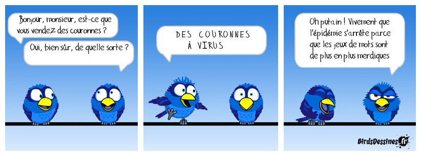 Case 1:Bird 1: Bonjour, monsieur, est-ce que vous vendez des couronnes ?Bird 2: Oui, bien sûr, de quelle sorte ? | Case 2: Bird 1: D E S C O U RO N N E S À V I RU S | Case 3: Bird 1: Oh putain ! Vivement que l'épidémie s'arrête parce que les jeux de mots sont de plus en plus merdiques
