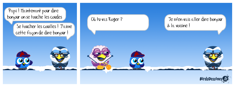 Case 1:Bird 1: Papi ! Maintenant pour dire bonjour on se touche les coudes Bird 2: Se toucher les couilles ! J'aime cette façon de dire bonjour ! | Case 2: Bird 1: Où tu vas Roger ? | Case 3: Bird 1: Je m'en vais aller dire bonjour à la voisine !
