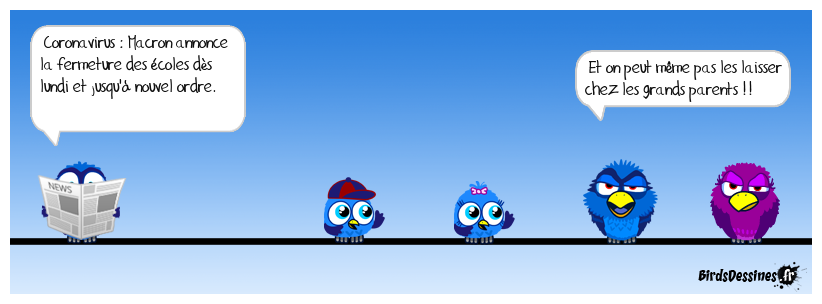 Case 1:Bird 1: Coronavirus : Macron annonce la fermeture des écoles dès lundi et jusqu'à nouvel ordre. | Case 2: Bird 1: J'en ai rêvé, Macron l'a fait ! | Case 3: Bird 1: Et on peut même pas les laisser chez les grands parents !!