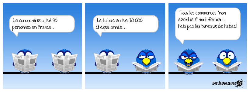 Case 1:Bird 1: Le coronavirus a tué 90 personnes en France... | Case 2: Bird 1: Le tabac en tue 70 000 chaque année... | Case 3: Bird 1: Tous les commerces "non essentiels" vont fermer... Mais pas les bureaux de tabac!