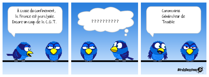 Case 1:Bird 1: À cause du confinement, la France est paralysée. Encore un coup de la C.G.T. | Case 2: Bird 1: ? ? ? ? ? ? ? ? ? ? | Case 3: Bird 1: Coronavirus Générateur de Trouble