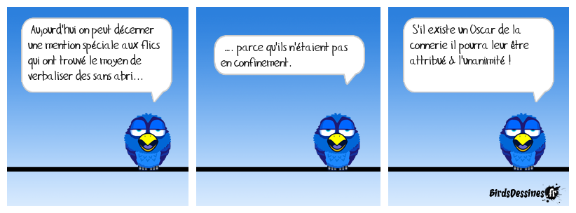 Case 1:Bird 1: Aujourd'hui on peut décerner une mention spéciale aux flics qui ont trouvé le moyen de verbaliser des sans abri... | Case 2: Bird 1: …. parce qu'ils n'étaient pas en confinement. | Case 3: Bird 1: S'il existe un Oscar de la connerie il pourra leur être attribué à l'unanimité !
