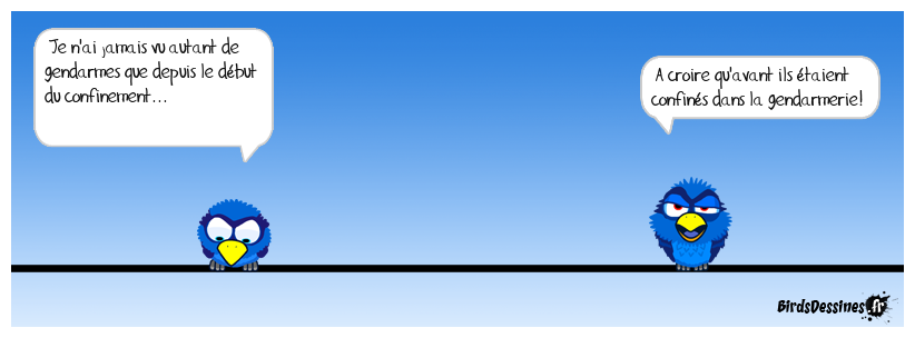 Case 1:Bird 1: Je n'ai jamais vu autant de gendarmes que depuis le début du confinement... | Case 2: | Case 3: Bird 1: A croire qu'avant ils étaient confinés dans la gendarmerie!