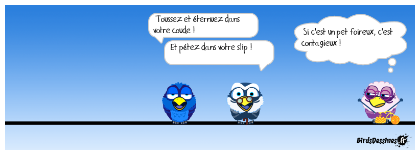Case 1: | Case 2: Bird 1: Toussez et éternuez dans votre coude ! Bird 2: Et pétez dans votre slip ! | Case 3: Bird 1: Si c'est un pet foireux, c'est contagieux !