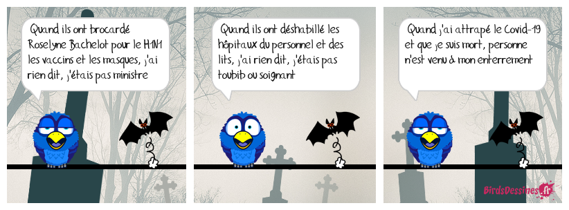 Case 1:Bird 1: Quand ils ont brocardé Roselyne Bachelot pour le H1N1 les vaccins et les masques, j'ai rien dit, j'étais pas ministre | Case 2: Bird 1: Quand ils ont déshabillé les hôpitaux du personnel et des lits, j'ai rien dit, j'étais pas toubib ou soignant | Case 3: Bird 1: Quand j'ai attrapé le Covid-19 et que je suis mort, personne n'est venu à mon enterrement