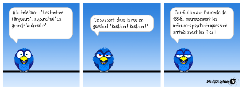 Case 1:Bird 1: À la télé hier : "Les tontons flingueurs", aujourd'hui "La grande Vadrouille"... | Case 2: Bird 1: Je suis sorti dans la rue en gueulant "Doublon ! Doublon !" | Case 3: Bird 1: J'ai failli avoir l'amende de 135€, heureusement les infirmiers psychiatriques sont arrivés avant les flics !