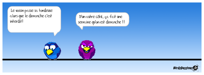 Case 1:Bird 1: Le voisin passe sa tondeuse alors que le dimanche c'est interdit! | Case 2: Bird 1: D'un autre côté, ça fait une semaine qu'on est dimanche !! | Case 3: