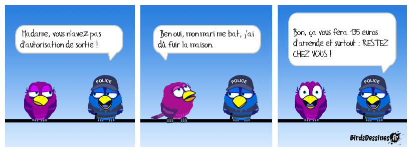 Case 1:Bird 1: Madame, vous n'avez pas d'autorisation de sortie ! | Case 2: Bird 1: Ben oui, mon mari me bat, j'ai dû fuir la maison. | Case 3: Bird 1: Bon, ça vous fera 135 euros d'amende et surtout : RESTEZ CHEZ VOUS !
