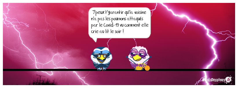 Case 1: | Case 2: Bird 1: J'peux t'garantir qu'la voisine n'a pas les poumons attaqués par le Covid-19 vu comment elle crie au lit le soir ! | Case 3: