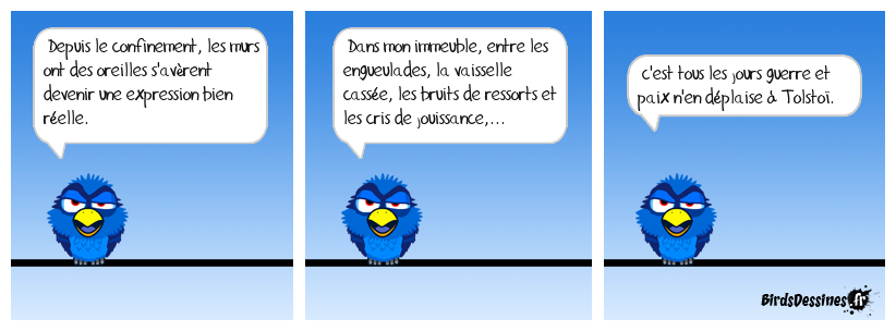 Case 1:Bird 1: Depuis le confinement, les murs ont des oreilles s'avèrent devenir une expression bien réelle. | Case 2: Bird 1: Dans mon immeuble, entre les engueulades, la vaisselle cassée, les bruits de ressorts et les cris de jouissance,... | Case 3: Bird 1: c'est tous les jours guerre et paix n'en déplaise à Tolstoî.