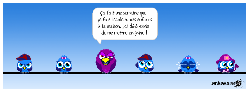 Case 1: | Case 2: Bird 1: Ça fait une semaine que je fais l'école à mes enfants à la maison, j'ai déjà envie de me mettre en grève ! | Case 3: