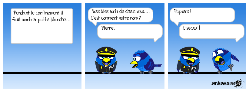 Case 1:Bird 1: Pendant le confinement il faut montrer patte blanche... | Case 2: Bird 1: Vous êtes sorti de chez vous.... C'est comment votre nom ? Bird 2: Pierre. | Case 3: Bird 1: Papiers ! Bird 2: Ciseaux !