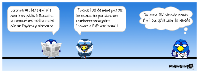 Case 1:Bird 1: Coronavirus : tests gratuits ouverts au public à Marseille. La communauté médicale divi- -sée sur l'hydroxychloroquine | Case 2: Bird 1: Tu crois tout de même pas que les mandarins parisiens vont cautionner un vulgaire "provincial" d'avoir trouvé ! | Case 3: Bird 1: On leur a filé plein de virusés, s'rait con qu'ils aient le remède