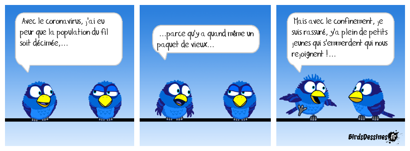 Case 1:Bird 1: Avec le coronavirus, j'ai eu peur que la population du fil soit décimée,... | Case 2: Bird 1: ...parce qu'y a quand même un paquet de vieux... | Case 3: Bird 1: Mais avec le confinement, je suis rassuré, y'a plein de petits jeunes qui s'emmerdent qui nous rejoignent !...