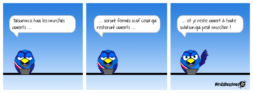 Case 1:Bird 1: Désormais tous les marchés ouverts ... | Case 2: Bird 1: ... seront fermés sauf ceux qui resteront ouverts ... | Case 3: Bird 1: ... et je reste ouvert à toute solution qui peut marcher !