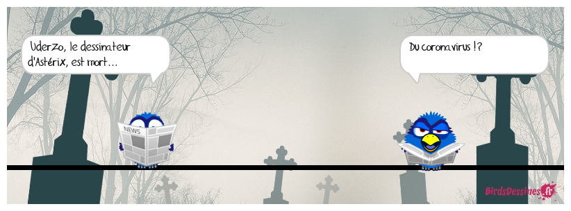 Case 1:Bird 1: Uderzo, le dessinateur d'Astérix, est mort... | Case 2: | Case 3: Bird 1: Du coronavirus !?