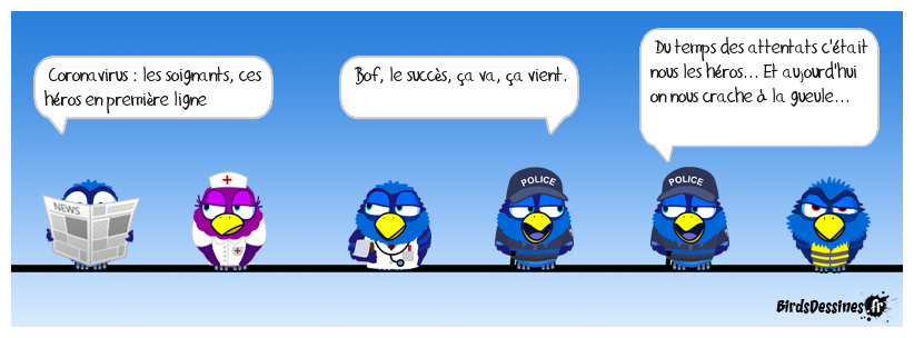 Case 1:Bird 1: Coronavirus : les soignants, ces héros en première ligne | Case 2: Bird 1: Bof, le succès, ça va, ça vient. | Case 3: Bird 1: Du temps des attentats c'était nous les héros... Et aujourd'hui on nous crache à la gueule...