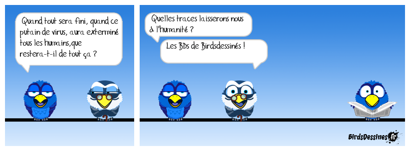 Case 1:Bird 1: Quand tout sera fini, quand ce putain de virus, aura exterminé tous les humains,que restera-t-il de tout ça ? | Case 2: Bird 1: Quelles traces laisserons nous à l'humanité ? Bird 2: Les BDs de Birdsdessinés ! | Case 3:
