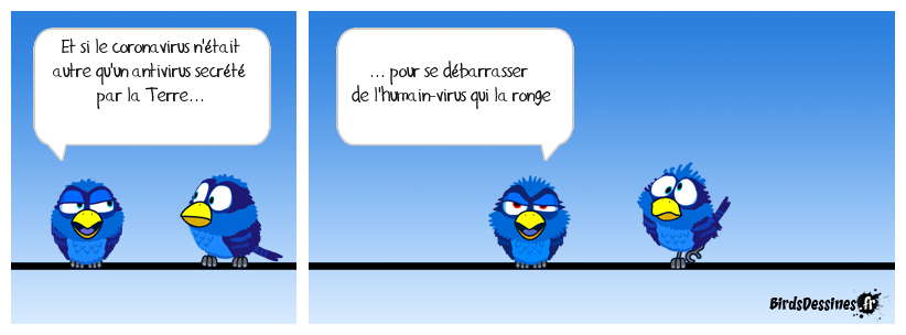 Case 1:Bird 1: Et si le coronavirus n'était autre qu'un antivirus secrété par la Terre... | Case 2: Bird 1: ... pour se débarrasser de l'humain-virus qui la ronge | Case 3: