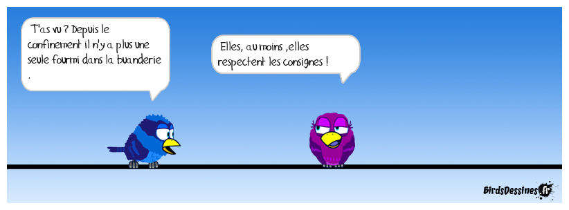 Case 1:Bird 1: T'as vu ? Depuis le confinement il n'y a plus une seule fourmi dans la buanderie . | Case 2: Bird 1: Elles, au moins ,elles respectent les consignes ! | Case 3: