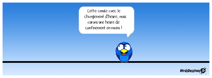 Case 1: | Case 2: Bird 1: Cette année avec le changement d'heure, nous aurons une heure de confinement en moins ! | Case 3: