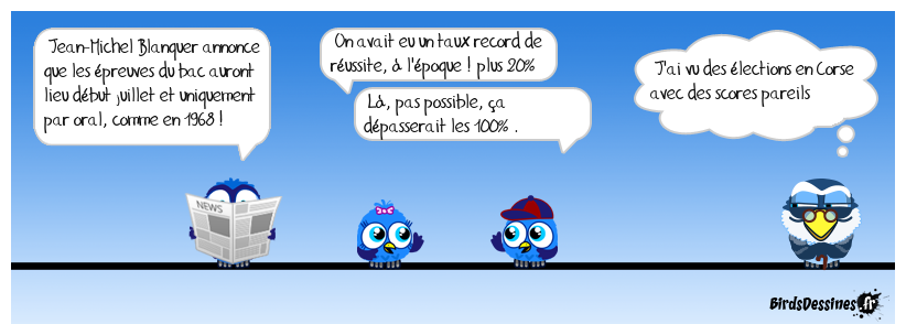 Case 1:Bird 1: Jean-Michel Blanquer annonce que les épreuves du bac auront lieu début juillet et uniquement par oral, comme en 1968 ! | Case 2: Bird 1: On avait eu un taux record de réussite, à l'époque ! plus 20% Bird 2: Là, pas possible, ça dépasserait les 100% . | Case 3: Bird 1: J'ai vu des élections en Corse avec des scores pareils