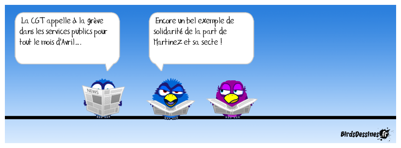 Case 1:Bird 1: La CGT appelle à la grève dans les services publics pour tout le mois d'Avril…. | Case 2: Bird 1: Encore un bel exemple de solidarité de la part de Martinez et sa secte ! | Case 3: