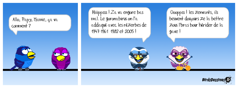 Case 1:Bird 1: Allo, Papy, Mamie, ça va comment ? | Case 2: Bird 1: Hiiippsss ! Za va engore bas mal. Le goronabirus on l'a addaqué avec les rézerbes de 1947 1961 1982 et 2005 ! | Case 3: Bird 1: Oooppss ! les zenvants, ils beuvent doujours ze la bettre zous l'bras bour hérider de la gave !