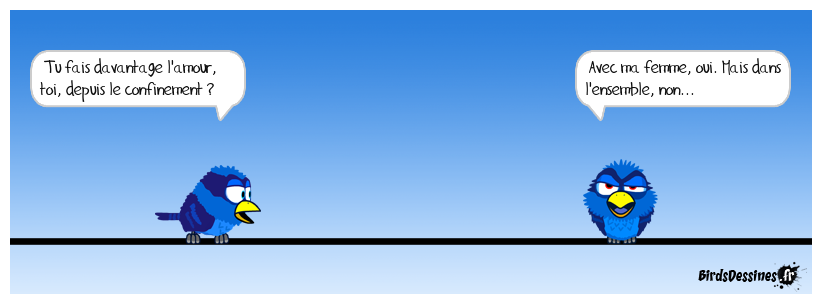 Case 1:Bird 1: Tu fais davantage l'amour, toi, depuis le confinement ? | Case 2: | Case 3: Bird 1: Avec ma femme, oui. Mais dans l'ensemble, non...