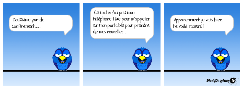 Case 1:Bird 1: Douzième jour de confinement….. | Case 2: Bird 1: Ce matin j'ai pris mon téléphone fixe pour m'appeler sur mon portable pour prendre de mes nouvelles... | Case 3: Bird 1: Apparemment je vais bien. Me voilà rassuré !